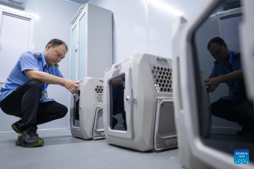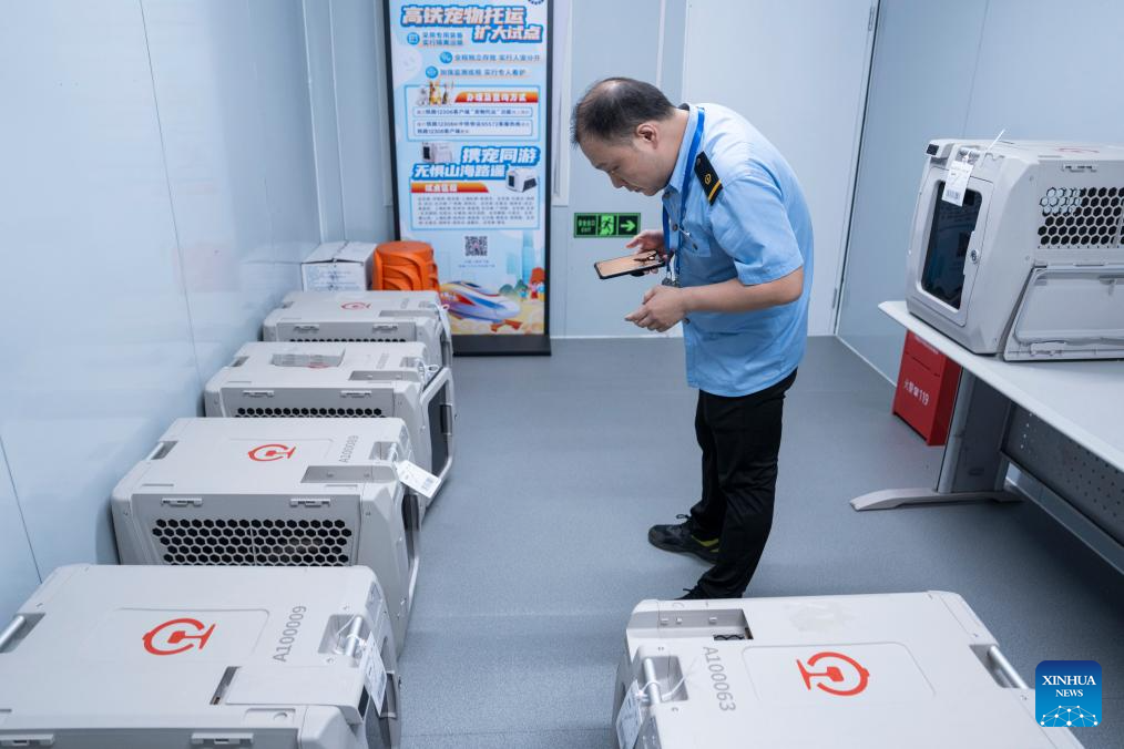A staff member checks the condition of a pet transport case at Wuhan Railway Station in Wuhan, central China's Hubei Province, July 1, 2025. On the first day of this year's summer travel rush, some qualified domesticated cats and dogs boarded on bullet trains accompanying their owners in Wuhan on Tuesday, as the pilot pet consignment service on high-speed railways expanded its scope from June 20.
