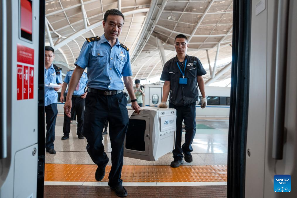 Staff members transport a pet transport case to a train at Wuhan Railway Station in Wuhan, central China's Hubei Province, July 1, 2025. On the first day of this year's summer travel rush, some qualified domesticated cats and dogs boarded on bullet trains accompanying their owners in Wuhan on Tuesday, as the pilot pet consignment service on high-speed railways expanded its scope from June 20.