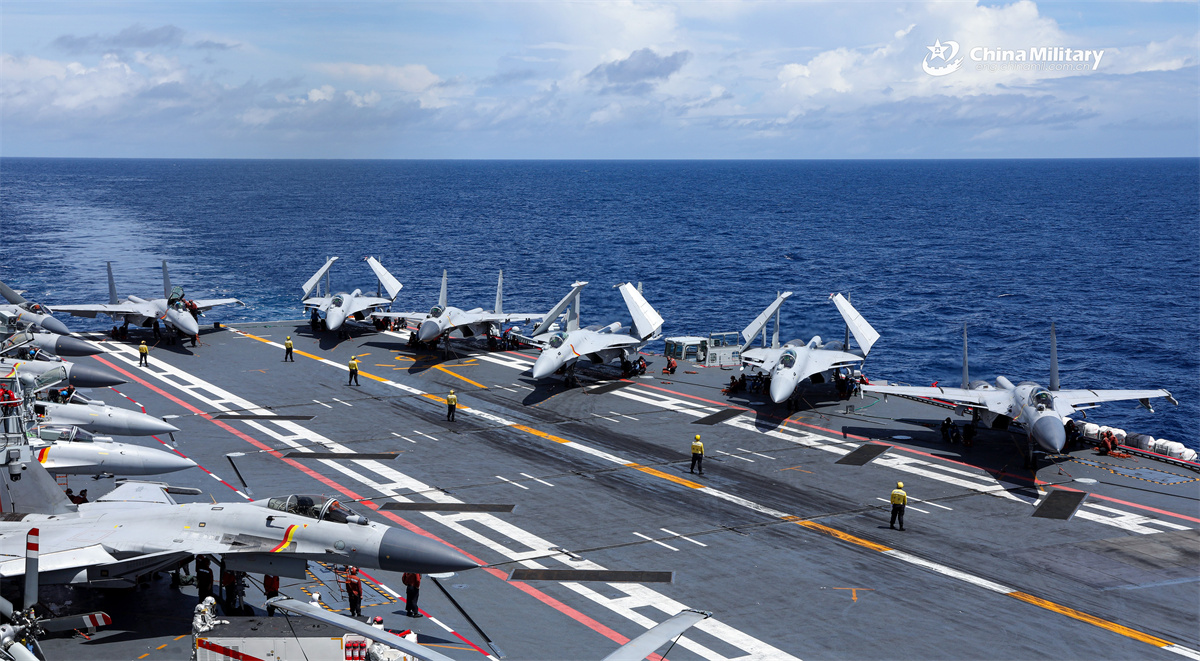 A group of carrier-based fighter jets attached to the Navy of Chinese People's Liberation Army (PLA) sit abreast on the flightline aboard the flight deck of the aircraft carrier Shandong (Hull 17). Two Chinese PLA Navy's aircraft carrier task forces, Liaoning (Hull 16) and Shandong (Hull 17), recently completed their combat-oriented far-sea training and safely returned to their home ports. (eng.chinamil.com.cn/Wang Jian)
