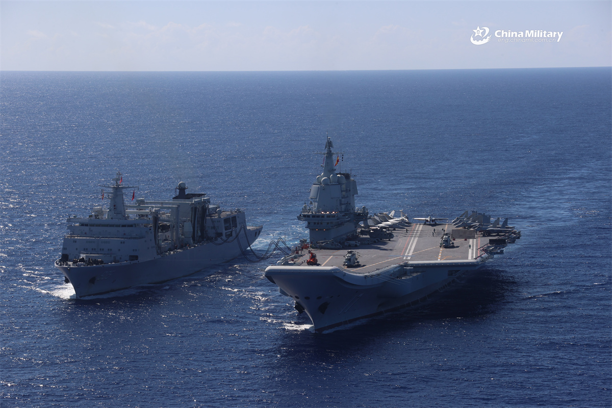 The Chinese aircraft carrier Liaoning (Hull 17) conducts alongside replenishment-at-sea with a Type 905 comprehensive supply ship during a far-sea training exercise. Two Chinese PLA Navy's aircraft carrier task forces, Liaoning (Hull 16) and Shandong (Hull 17), recently completed their combat-oriented far-sea training and safely returned to their home ports. (eng.chinamil.com.cn/Wang Jian)