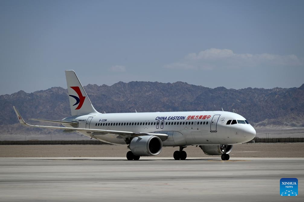 The inaugural Changchun-Xi'an-Dunhuang flight operated by China Eastern Airlines lands at Dunhuang Mogao International Airport in Dunhuang, northwest China's Gansu Province, July 1, 2025.