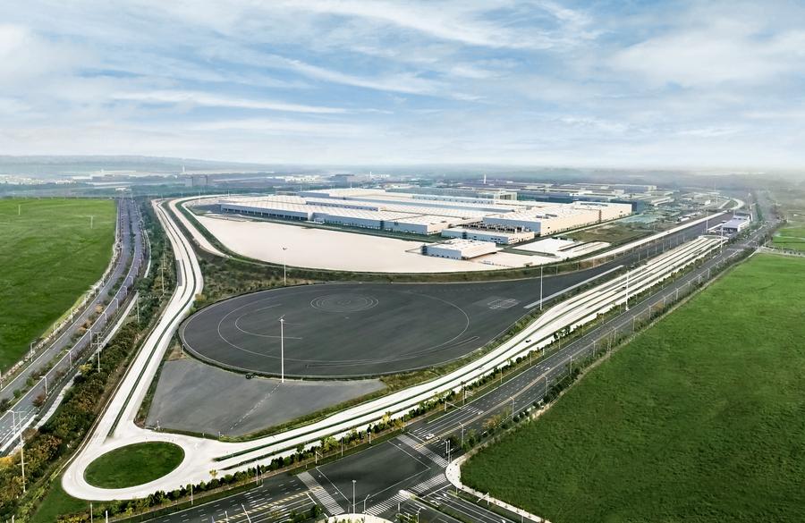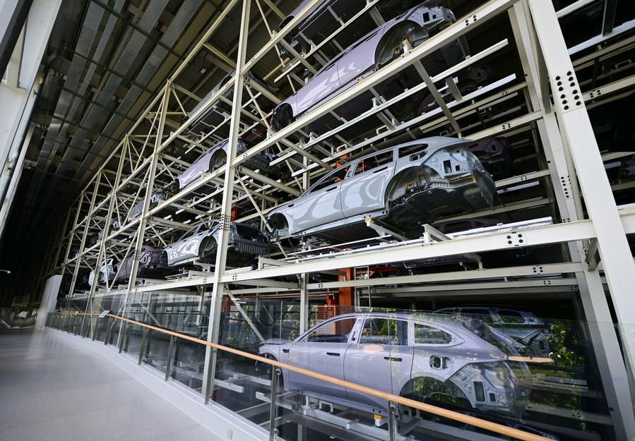 This photo shows a "Rubik's Cube" garage that accommodates vehicle frames at the NIO Second Advanced Manufacturing Base in Hefei, east China's Anhui Province, July 1, 2025. (Xinhua/Zhou Mu)