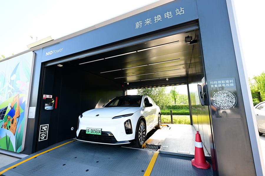 A new energy vehicle demonstrates battery swapping at the NIO Second Advanced Manufacturing Base in Hefei, east China's Anhui Province, July 1, 2025. (Xinhua/Zhou Mu)