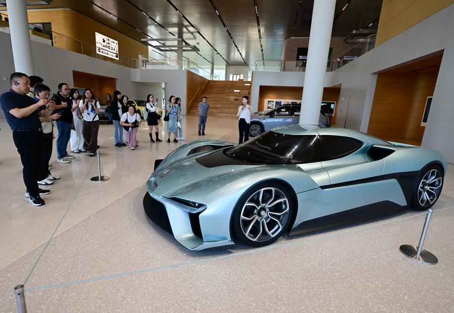 Media professionals learn about a new energy vehicle at the NIO Second Advanced Manufacturing Base in Hefei, east China's Anhui Province, July 1, 2025. (Xinhua/Zhou Mu)