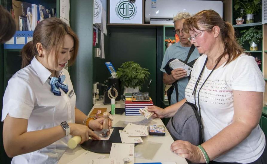 A foreign tourist mails postcards in a post office on the ancient city wall of Xi'an, northwest China's Shaanxi province, June 19, 2025. (Photo by Weng Qiyu/People's Daily Online)