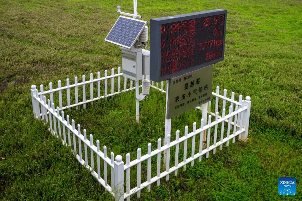 This photo taken on July 2, 2025 shows a climatic detector at the planting base of cranberry in Fuyuan City, northeast China's Heilongjiang Province. Located in the easternmost part of China, Fuyuan City is dubbed "the east pole of Huaxia (historical concept representing China)". In recent years, the city has continuously enhanced agricultural standardization and industrialization, vigorously developing modern agriculture that incorporates digital intelligence and ecological sustainability, a move expected to bring prosperity to the border area and improve locals' incomes. (Xinhua/Zhang Tao)