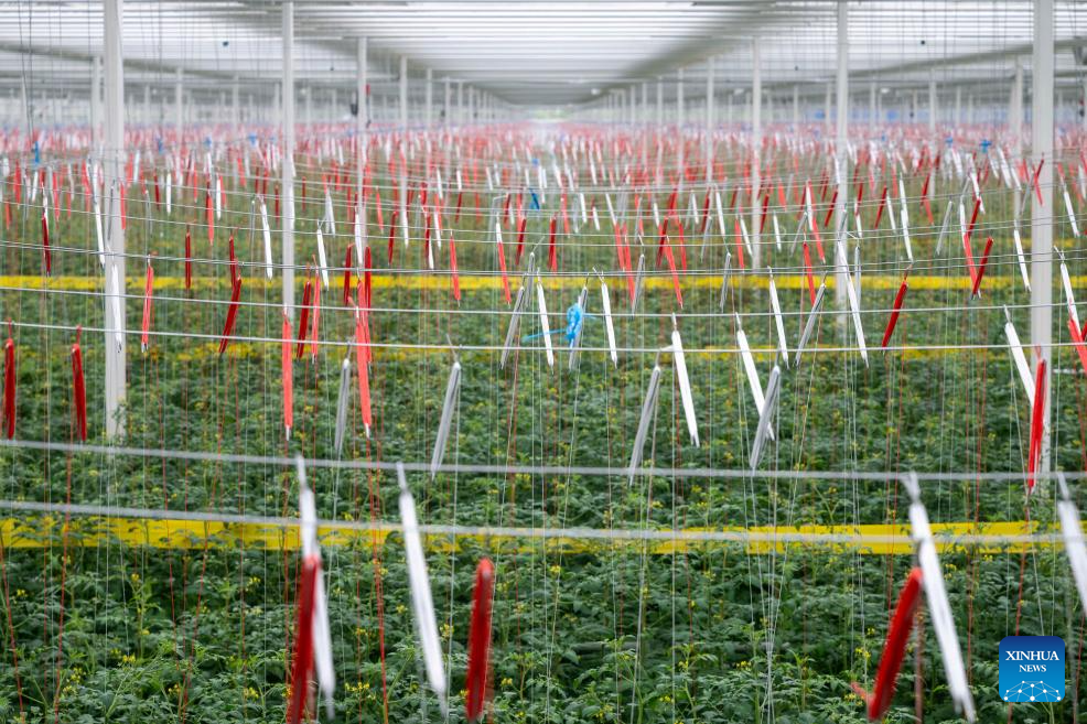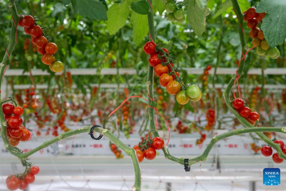 Cherry tomatoes are pictured at the smart glass greenhouses at a modern agricultural industrial park in Fuyuan City, northeast China's Heilongjiang Province, July 2, 2025. Located in the easternmost part of China, Fuyuan City is dubbed "the east pole of Huaxia (historical concept representing China)". In recent years, the city has continuously enhanced agricultural standardization and industrialization, vigorously developing modern agriculture that incorporates digital intelligence and ecological sustainability, a move expected to bring prosperity to the border area and improve locals' incomes. (Xinhua/Zhang Tao)