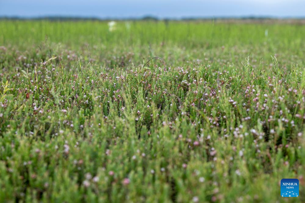This photo taken on July 2, 2025 shows cranberry seedlings at the planting base of cranberry in Fuyuan City, northeast China's Heilongjiang Province. Located in the easternmost part of China, Fuyuan City is dubbed "the east pole of Huaxia (historical concept representing China)". In recent years, the city has continuously enhanced agricultural standardization and industrialization, vigorously developing modern agriculture that incorporates digital intelligence and ecological sustainability, a move expected to bring prosperity to the border area and improve locals' incomes. (Xinhua/Zhang Tao)