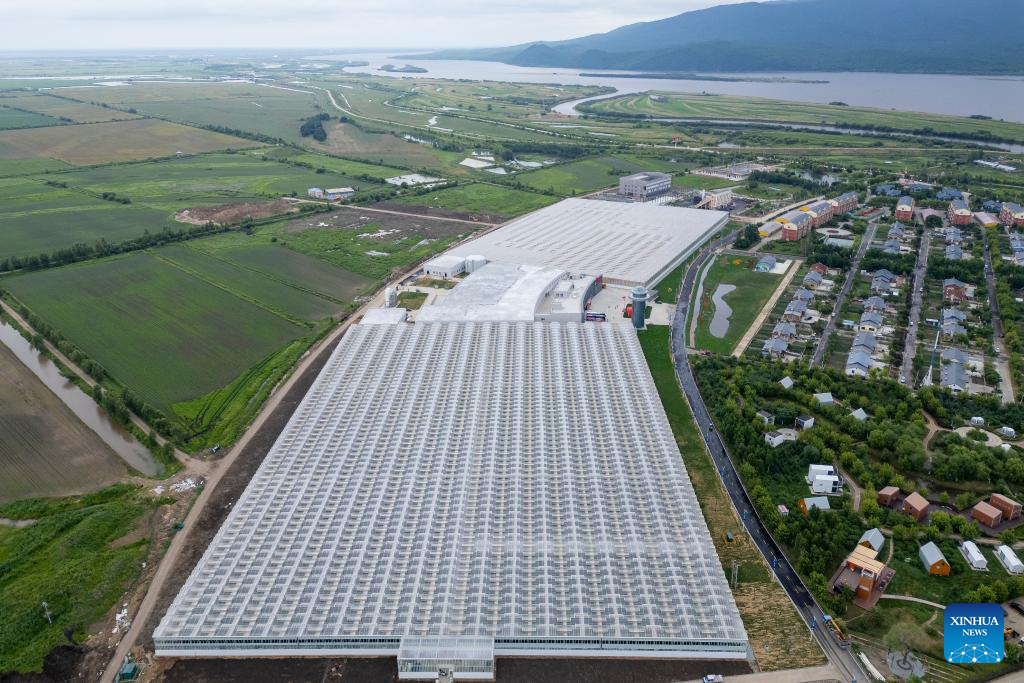 An aerial drone photo taken on July 2, 2025 shows the smart glass greenhouses at a modern agricultural industrial park in Fuyuan City, northeast China's Heilongjiang Province. Located in the easternmost part of China, Fuyuan City is dubbed "the east pole of Huaxia (historical concept representing China)". In recent years, the city has continuously enhanced agricultural standardization and industrialization, vigorously developing modern agriculture that incorporates digital intelligence and ecological sustainability, a move expected to bring prosperity to the border area and improve locals' incomes. (Xinhua/Zhang Tao)