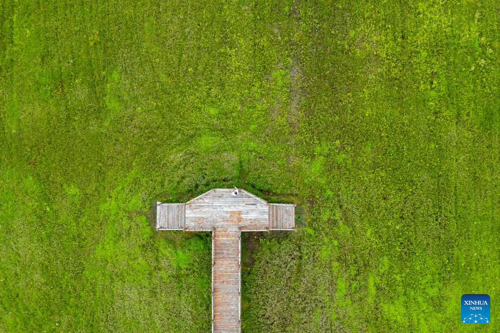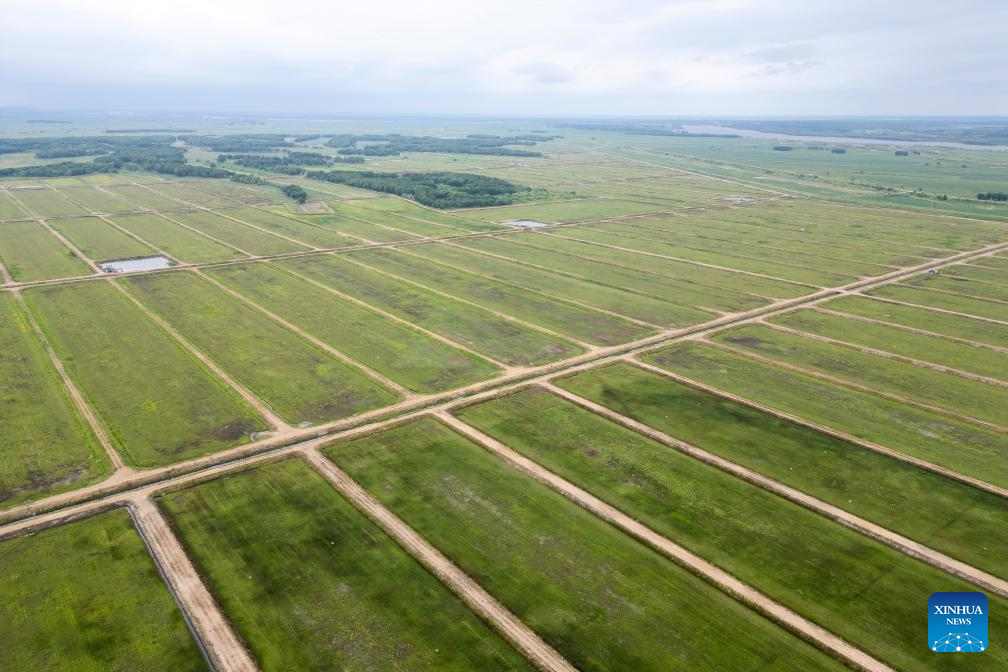 An aerial drone photo taken on July 2, 2025 shows a view of the planting base of cranberry in Fuyuan City, northeast China's Heilongjiang Province. Located in the easternmost part of China, Fuyuan City is dubbed "the east pole of Huaxia (historical concept representing China)". In recent years, the city has continuously enhanced agricultural standardization and industrialization, vigorously developing modern agriculture that incorporates digital intelligence and ecological sustainability, a move expected to bring prosperity to the border area and improve locals' incomes. (Xinhua/Zhang Tao)
