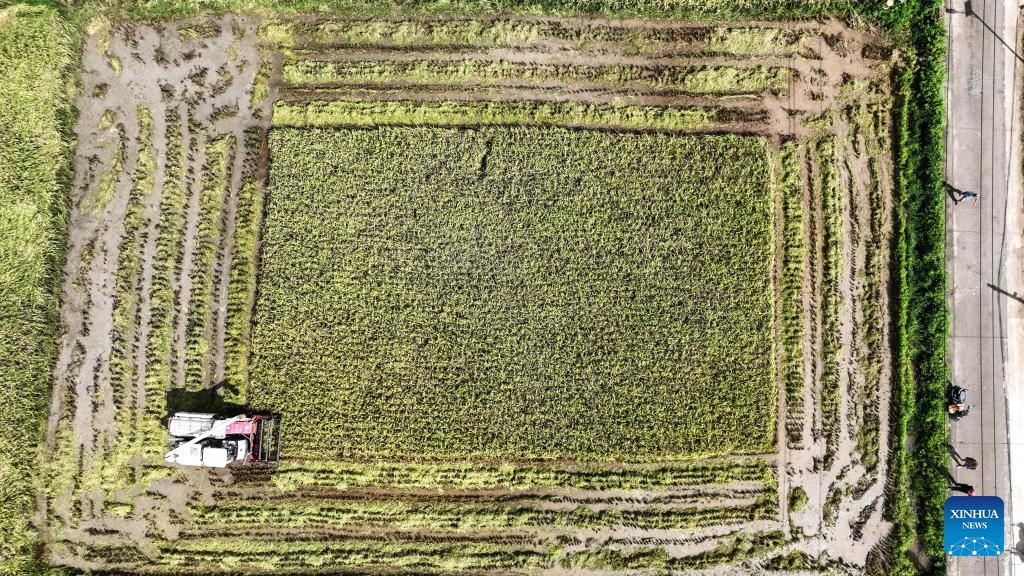 An aerial drone photo taken on July 2, 2025 shows a harvester reaping rice in Banping Village in Kangxiling Town of Qinzhou City, south China's Guangxi Zhuang Autonomous Region. Early rice harvest is in full swing here. (Xinhua/Zhang Ailin)