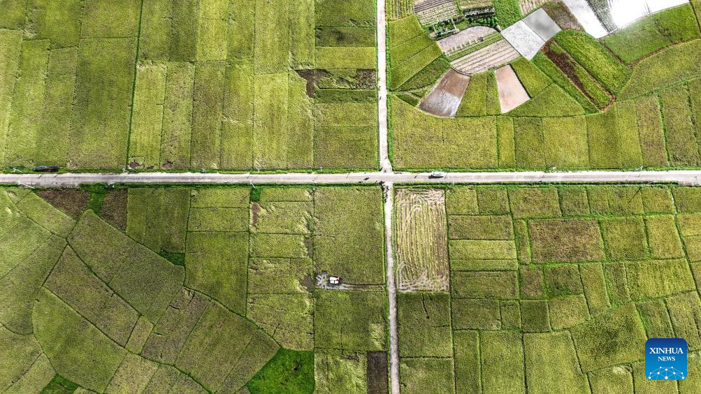 An aerial drone photo taken on July 2, 2025 shows the paddy fields in Kangxiling Town of Qinzhou City, south China's Guangxi Zhuang Autonomous Region. Early rice harvest is in full swing here. (Xinhua/Zhang Ailin)