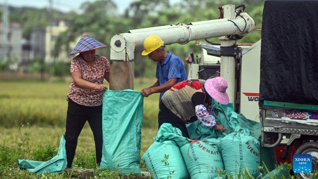 Farmers pack harvested rice in Banping Village in Kangxiling Town of Qinzhou City, south China's Guangxi Zhuang Autonomous Region, July 2, 2025. Early rice harvest is in full swing here. (Xinhua/Zhang Ailin)