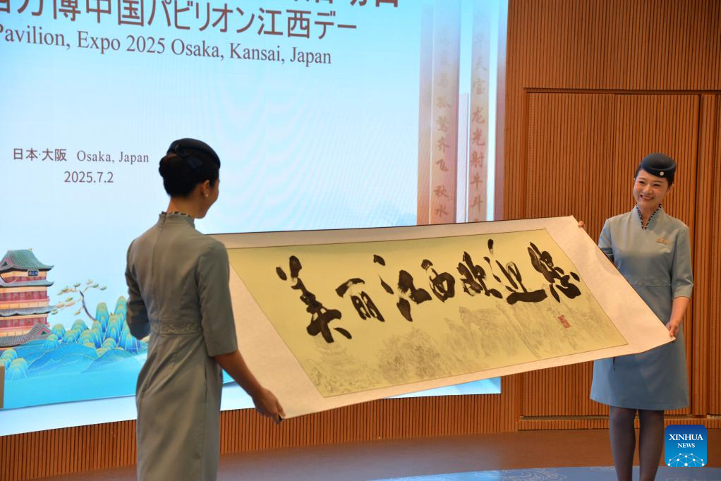 Opening ceremony of Jiangxi Day of China Pavilion is held at Expo 2025 Osaka in Osaka, Japan, on July 2, 2025. Jiangxi Day of China Pavilion was held Wednesday at Expo 2025 Osaka, with more than 120 guests attending the opening ceremony. Under the theme of "Building a Jiangxi Model of Beautiful China and Envisioning a Green Development Future for Jiangxi," the event featured exhibitions, investment promotions, cultural performances and intangible cultural heritage products display. (Xinhua/Tu Yifan)