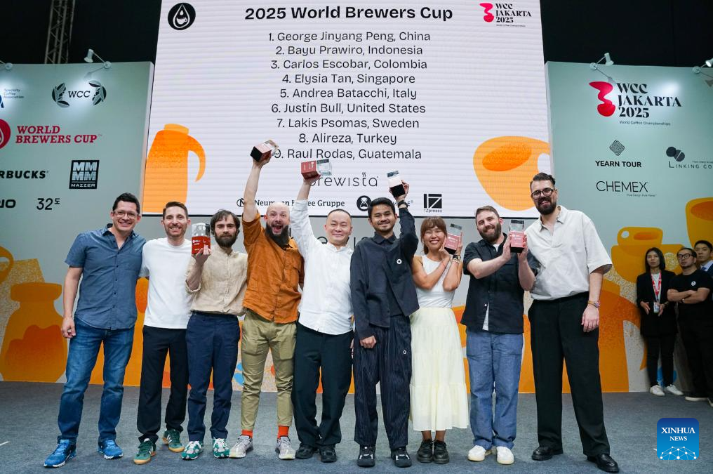 Chinese barista Peng Jinyang (C) celebrates winning the championship in the 2025 World Brewers Cup (WBC) in Jakarta, Indonesia, in May 2025. (Xinhua)