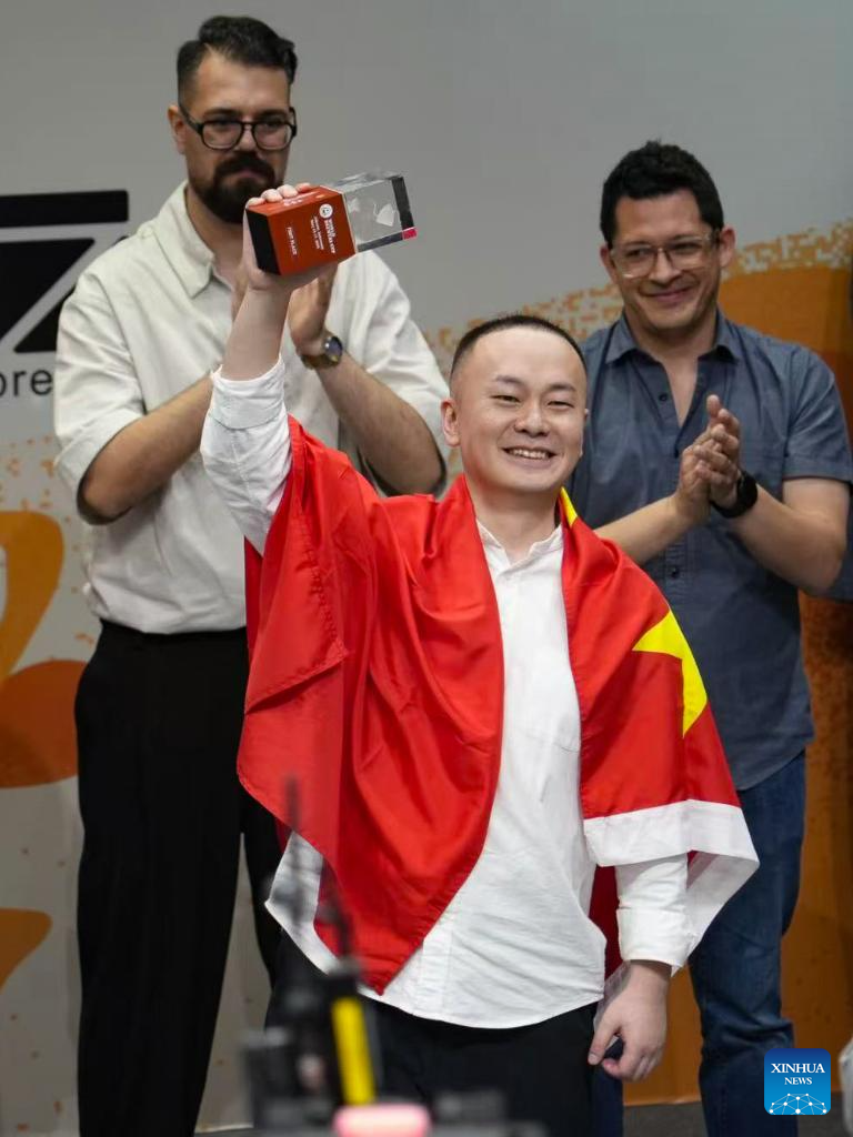 Peng Jinyang, the champion of the 2025 World Brewers Cup (WBC), presents the championship trophy in Guiyang, southwest China's Guizhou Province, May 23, 2025. (Xinhua/Ou Dongqu)