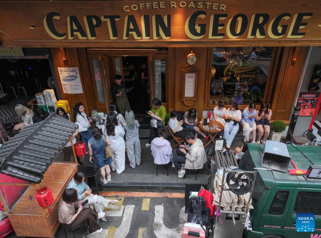 An aerial drone photo shows customers waiting to enjoy coffee outside Peng Jinyang's coffee shop Captain George, in Yunyan District of Guiyang, southwest China's Guizhou Province, June 23, 2025. (Xinhua/Yang Wenbin)