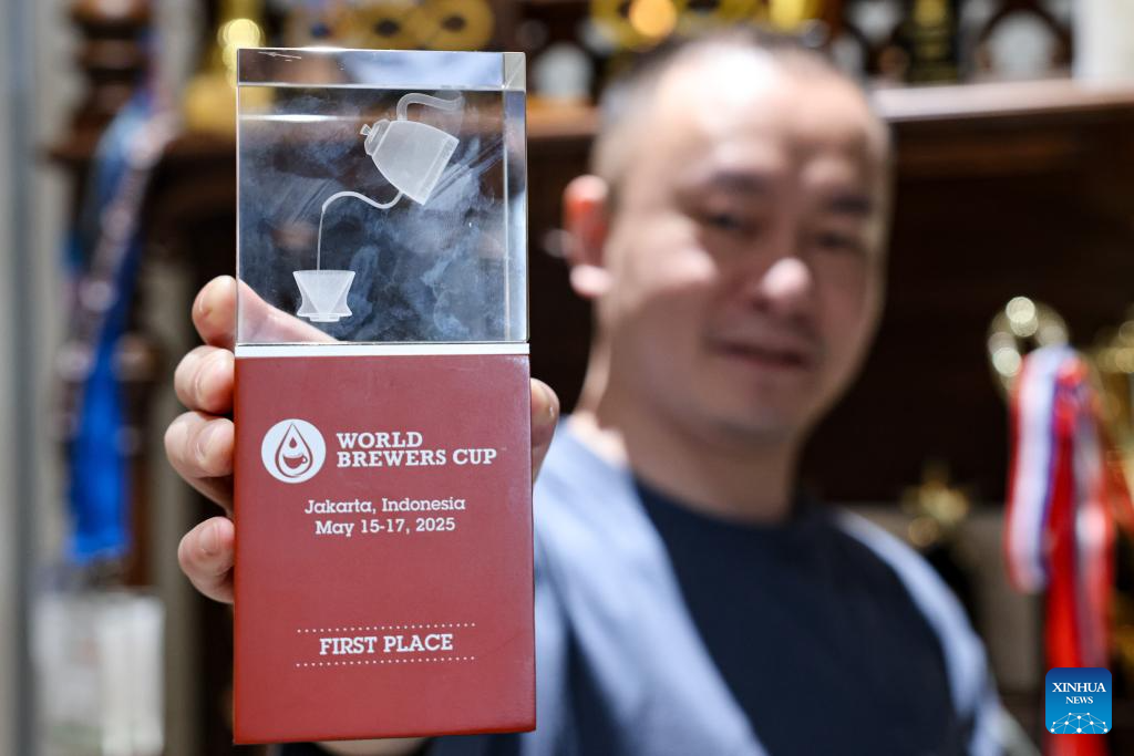 Peng Jinyang, the champion of the 2025 World Brewers Cup (WBC), views the championship trophy in Guiyang, southwest China's Guizhou Province, May 23, 2025. (Xinhua/Ou Dongqu)