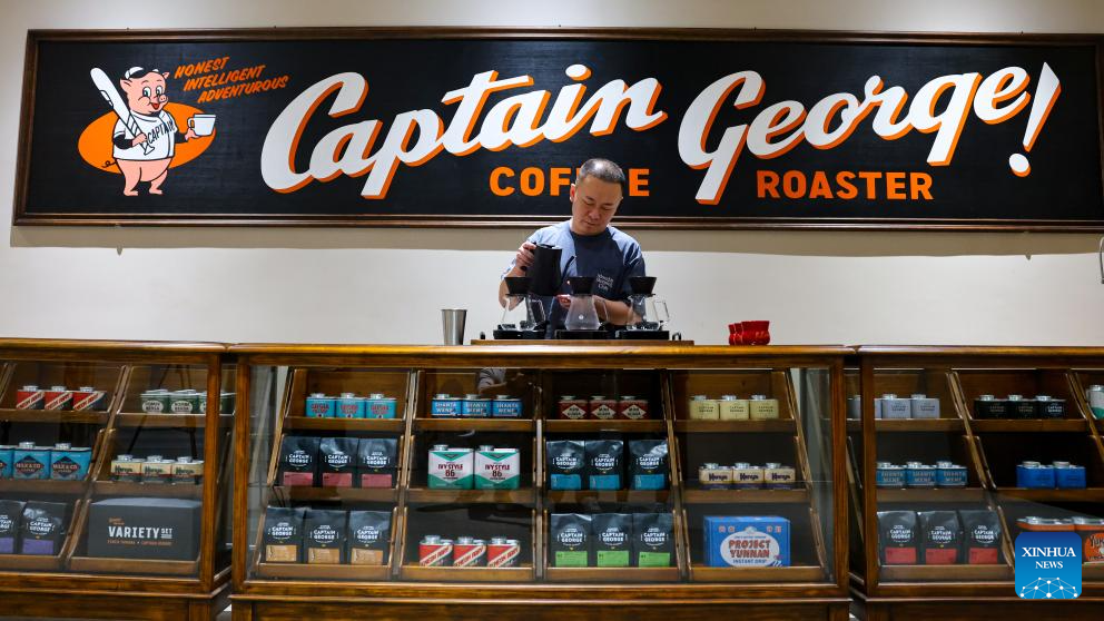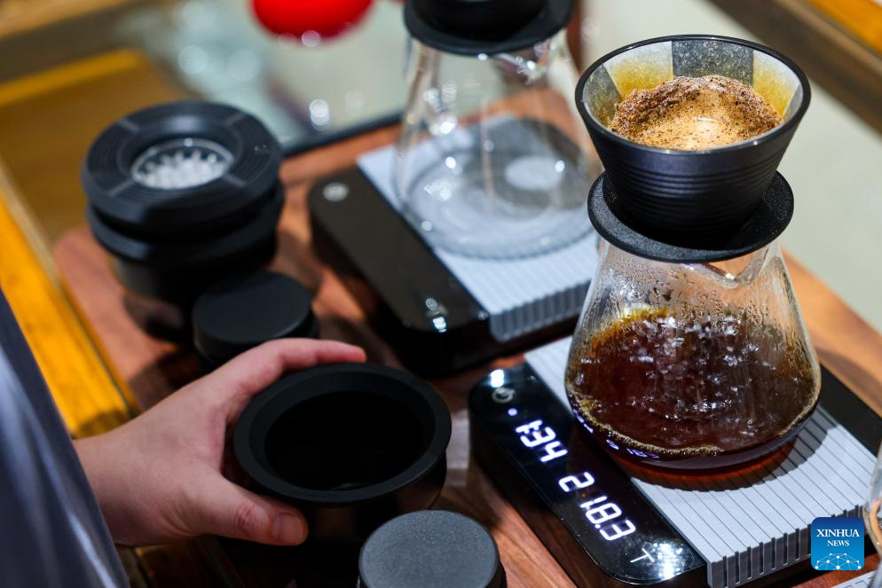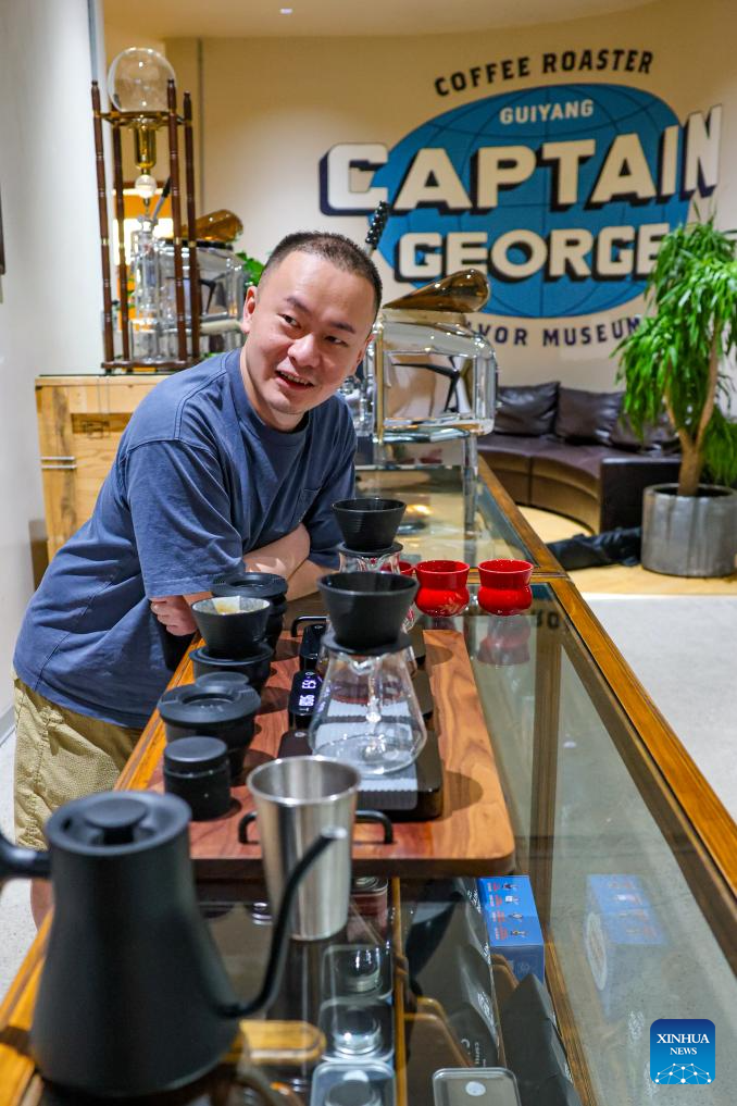 Peng Jinyang, the champion of the 2025 World Brewers Cup (WBC), makes hand drip coffee at his company in Guiyang, southwest China's Guizhou Province, May 23, 2025. (Xinhua/Ou Dongqu)