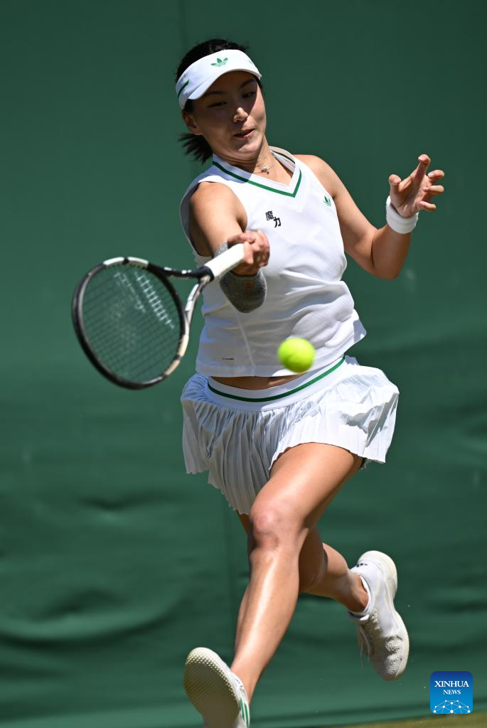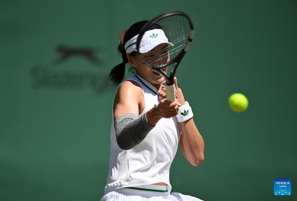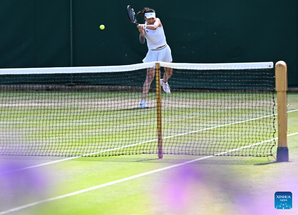 Wang Xinyu hits a return during the women's singles second round match between Wang Xinyu of China and Zeynep Sonmez of Türkiye at the Wimbledon Tennis Championships in London, Britain, July 3, 2025. (Xinhua/Li Ying)