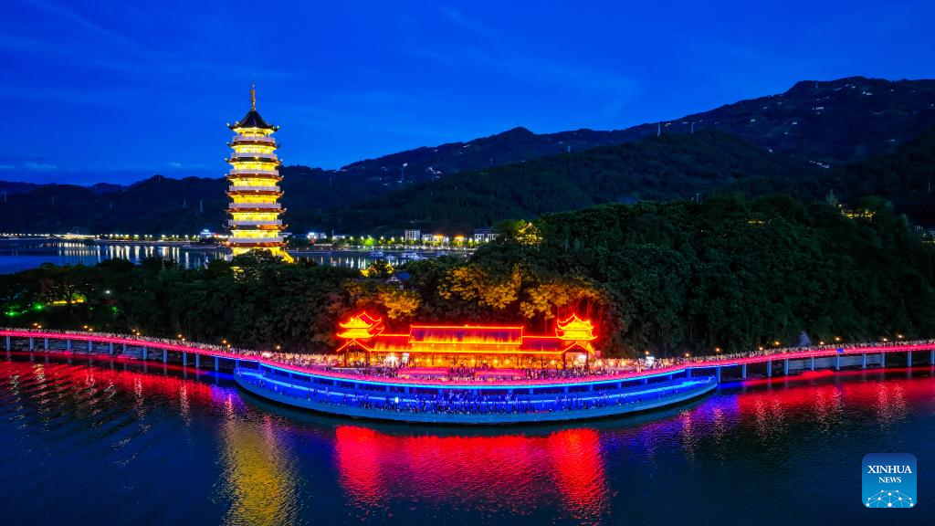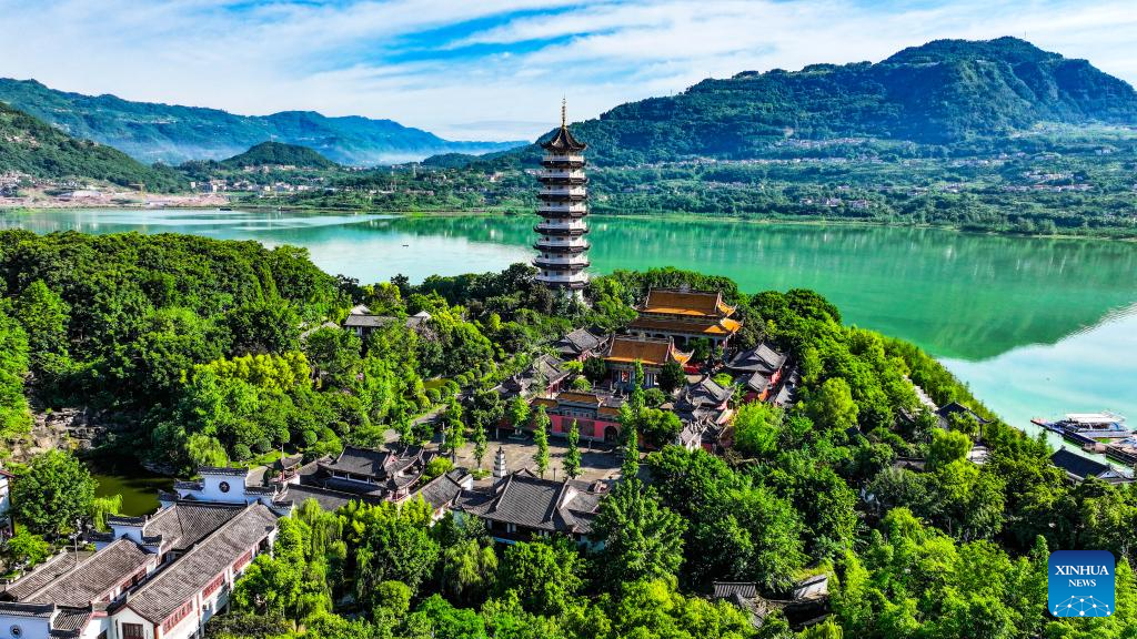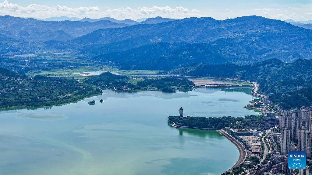An aerial drone photo taken on July 2, 2025 shows a view of Hanfeng Lake and urban area of Kaizhou District in southwest China's Chongqing. Kaizhou is noted for a scenic internal lake named Hanfeng, with a capacity of 80 million cubic meters. This artificial lake was built after the completion of the Three Gorges Dam. (Xinhua/Wang Quanchao)