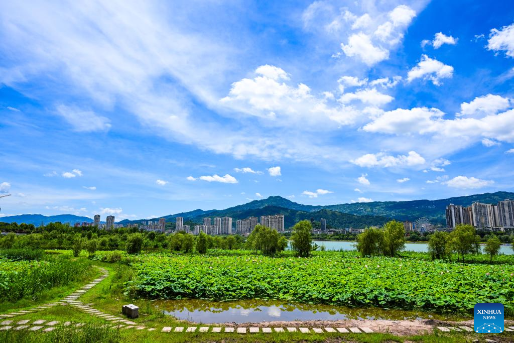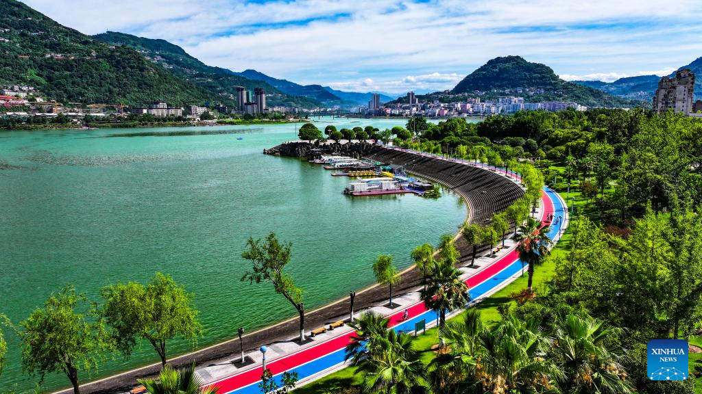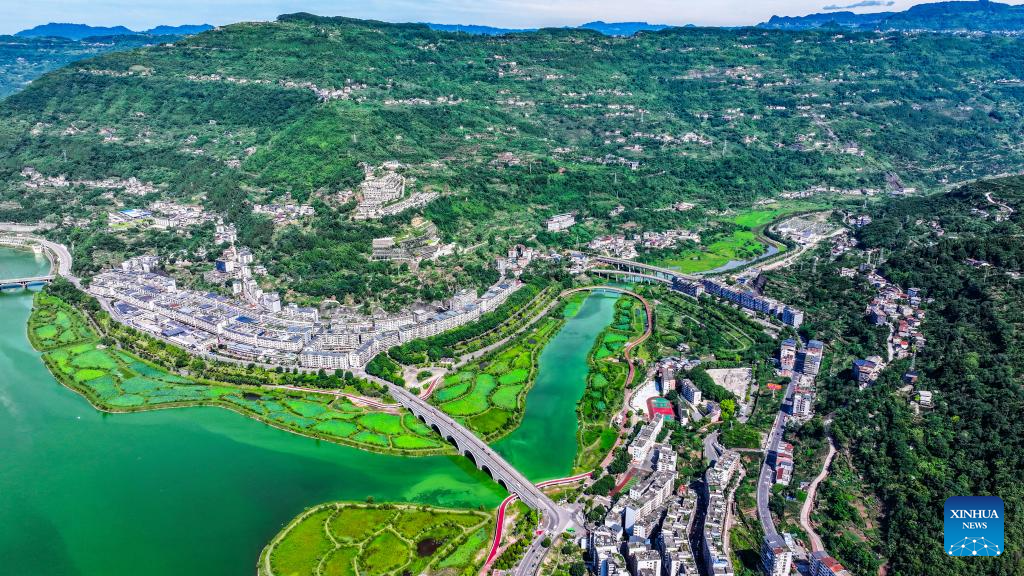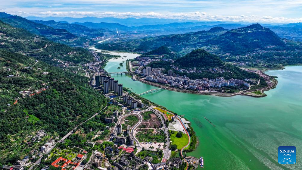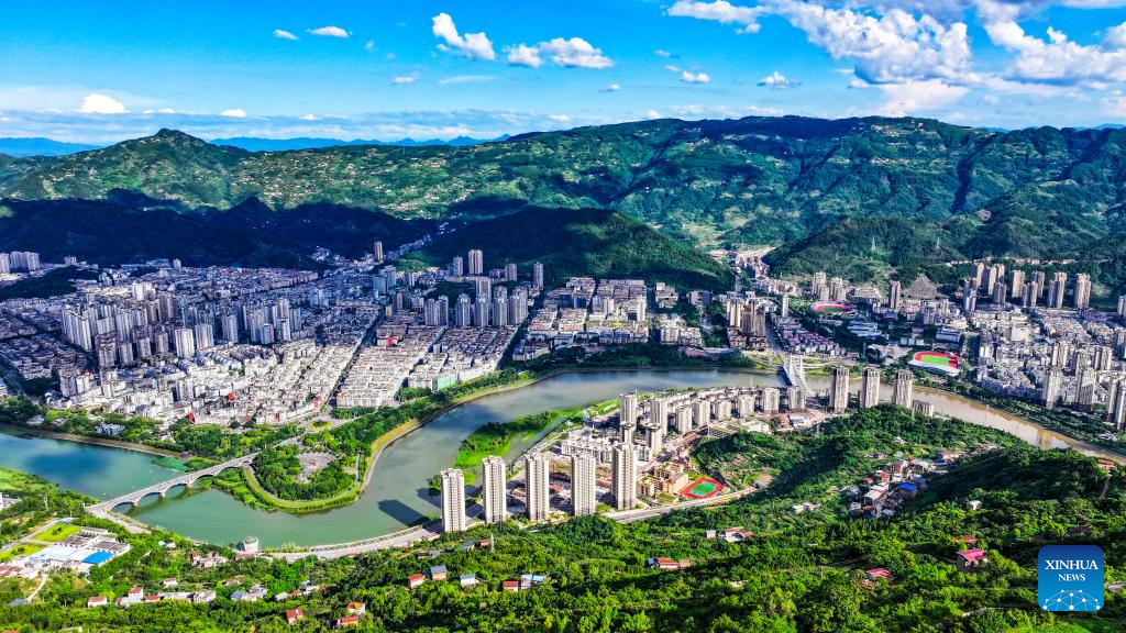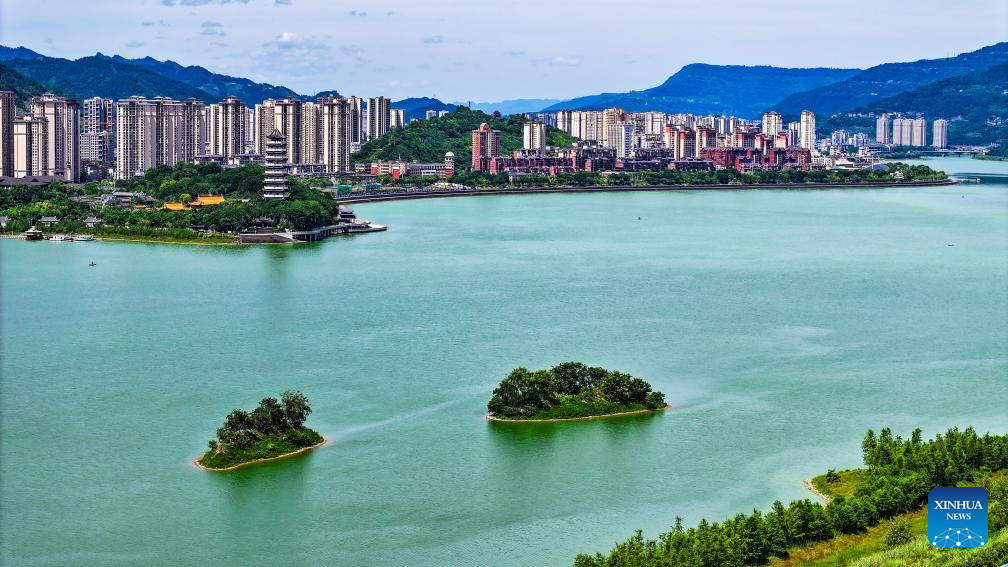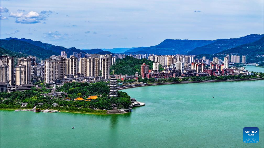 A drone photo taken on July 3, 2025 shows a view of urban area of Kaizhou District in southwest China's Chongqing. Kaizhou is noted for a scenic internal lake named Hanfeng, with a capacity of 80 million cubic meters. This artificial lake was built after the completion of the Three Gorges Dam. (Xinhua/Wang Quanchao)