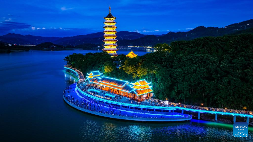 An aerial drone photo taken on July 2, 2025 shows a view of Hanfeng Lake in Kaizhou District in southwest China's Chongqing. Kaizhou is noted for a scenic internal lake named Hanfeng, with a capacity of 80 million cubic meters. This artificial lake was built after the completion of the Three Gorges Dam. (Xinhua/Wang Quanchao)