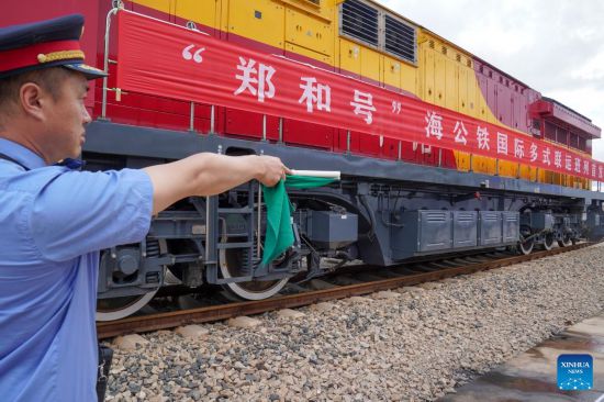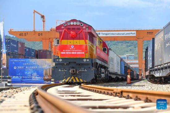 The first train of the "Zheng He" Sea-Road-Rail International Multimodal Transport Service departs from Tengjun International Land Port in Kunming, capital of southwest China's Yunnan Province, July 4, 2025. The train left Kunming on Friday. After arriving in Vientiane of Laos via the China-Laos Railway, the goods will be transported to Thailand, Singapore and Bangladesh through other three routes. (Xinhua/Peng Yikai)