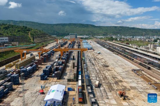 An aerial drone photo shows the first train of the "Zheng He" Sea-Road-Rail International Multimodal Transport Service waiting for departure at Tengjun International Land Port in Kunming, capital of southwest China's Yunnan Province, July 4, 2025. The train left Kunming on Friday. After arriving in Vientiane of Laos via the China-Laos Railway, the goods will be transported to Thailand, Singapore and Bangladesh through other three routes. (Xinhua/Peng Yikai)