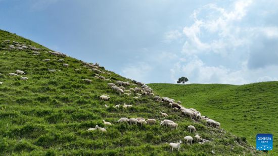 This photo taken on July 4, 2025 shows the scenery of the Wulanmaodu pasture in Horqin Right Wing Front Banner, Hinggan League, north China's Inner Mongolia Autonomous Region. In the first half of this year, the banner recorded 2.55 million tourist trips, with total tourism expenditure reaching 882 million yuan (about 123.12 million U.S. dollars). (Xinhua/Bei He)
