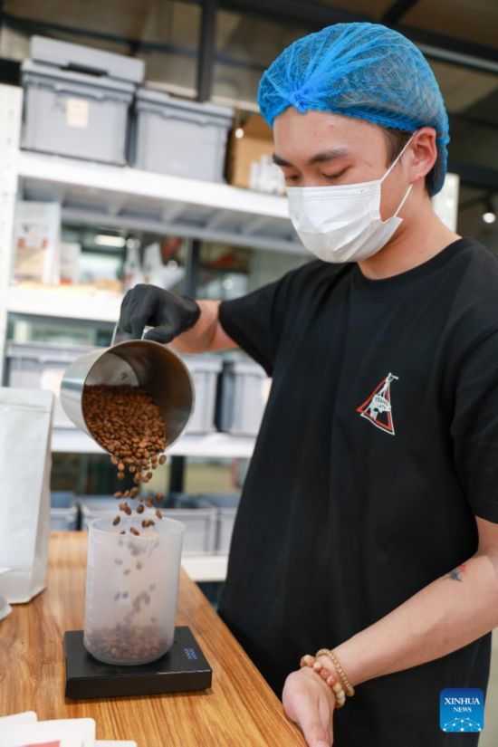 A shop assistant weighs coffee beans at a coffee shop in Guiyang, southwest China's Guizhou Province, June 9, 2025.