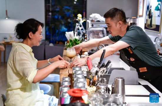 A shop owner serves a creative coffee product for a customer at a coffee shop in Guiyang, southwest China's Guizhou Province, June 23, 2025.