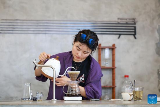A shop assistant makes coffee at a coffee shop in Guiyang, southwest China's Guizhou Province, June 9, 2025.