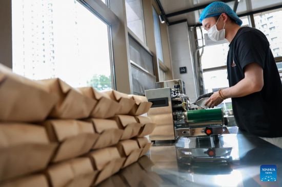 A shop assistant packs coffee beans at a coffee shop in Guiyang, southwest China's Guizhou Province, June 9, 2025.