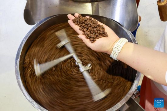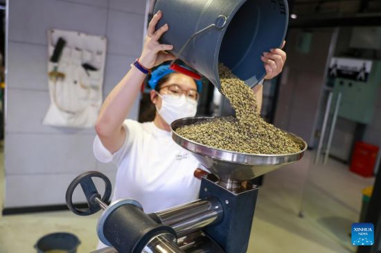A shop assistant roasts coffee beans at a coffee shop in Guiyang, southwest China's Guizhou Province, June 9, 2025.