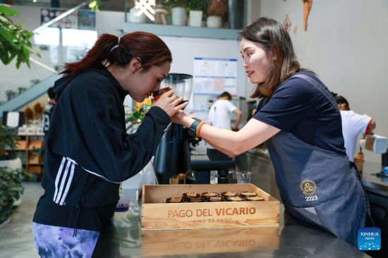 A customer from Chile (L) smells coffee at a coffee shop in Guiyang, southwest China's Guizhou Province, June 5, 2025.
