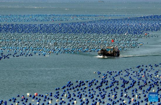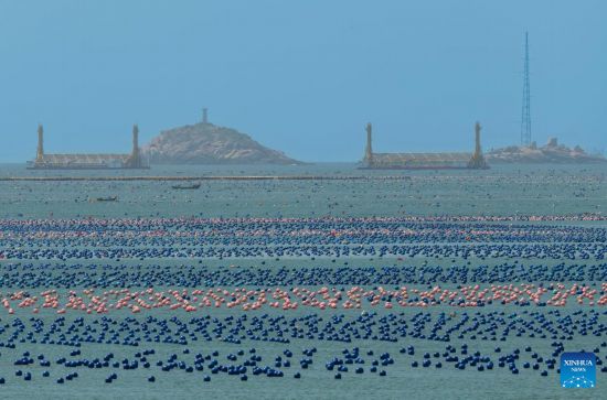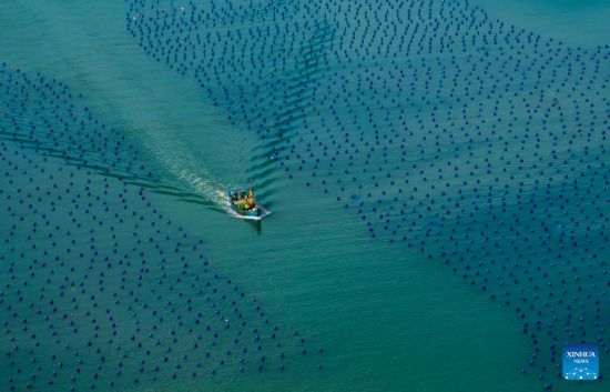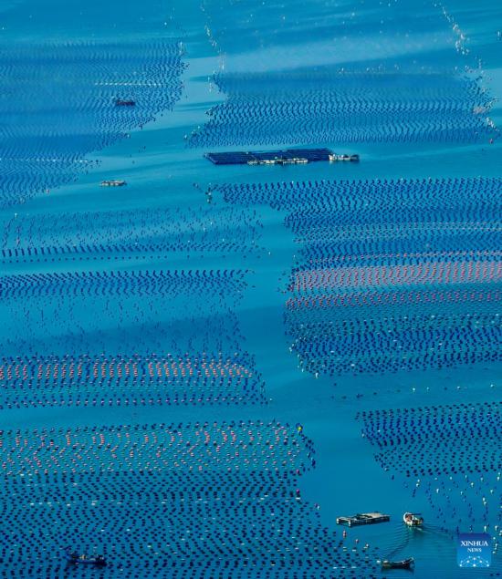 This photo taken on July 3, 2025 shows a marine ranch in Lianjiang County of Fuzhou, southeast China's Fujian Province. Leveraging its unique marine resources, distinctive fisheries industry, and regional economic advantages, Lianjiang County has in recent years been promoting the upgrade and intelligent transformation of deep-sea and far-sea mariculture platforms, and developing the farming of aquatic products such as kelp, large yellow croaker, and abalone.