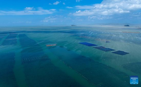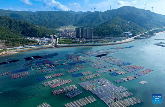 An aerial drone photo taken on July 3, 2025 shows a panoramic view of a national-level marine ranch in Lianjiang County of Fuzhou, southeast China's Fujian Province. Leveraging its unique marine resources, distinctive fisheries industry, and regional economic advantages, Lianjiang County has in recent years been promoting the upgrade and intelligent transformation of deep-sea and far-sea mariculture platforms, and developing the farming of aquatic products such as kelp, large yellow croaker, and abalone.