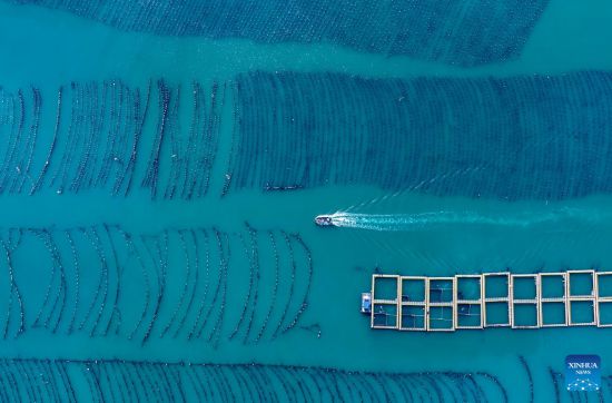 An aerial drone photo taken on July 3, 2025 shows a marine ranch in Lianjiang County of Fuzhou, southeast China's Fujian Province. Leveraging its unique marine resources, distinctive fisheries industry, and regional economic advantages, Lianjiang County has in recent years been promoting the upgrade and intelligent transformation of deep-sea and far-sea mariculture platforms, and developing the farming of aquatic products such as kelp, large yellow croaker, and abalone.