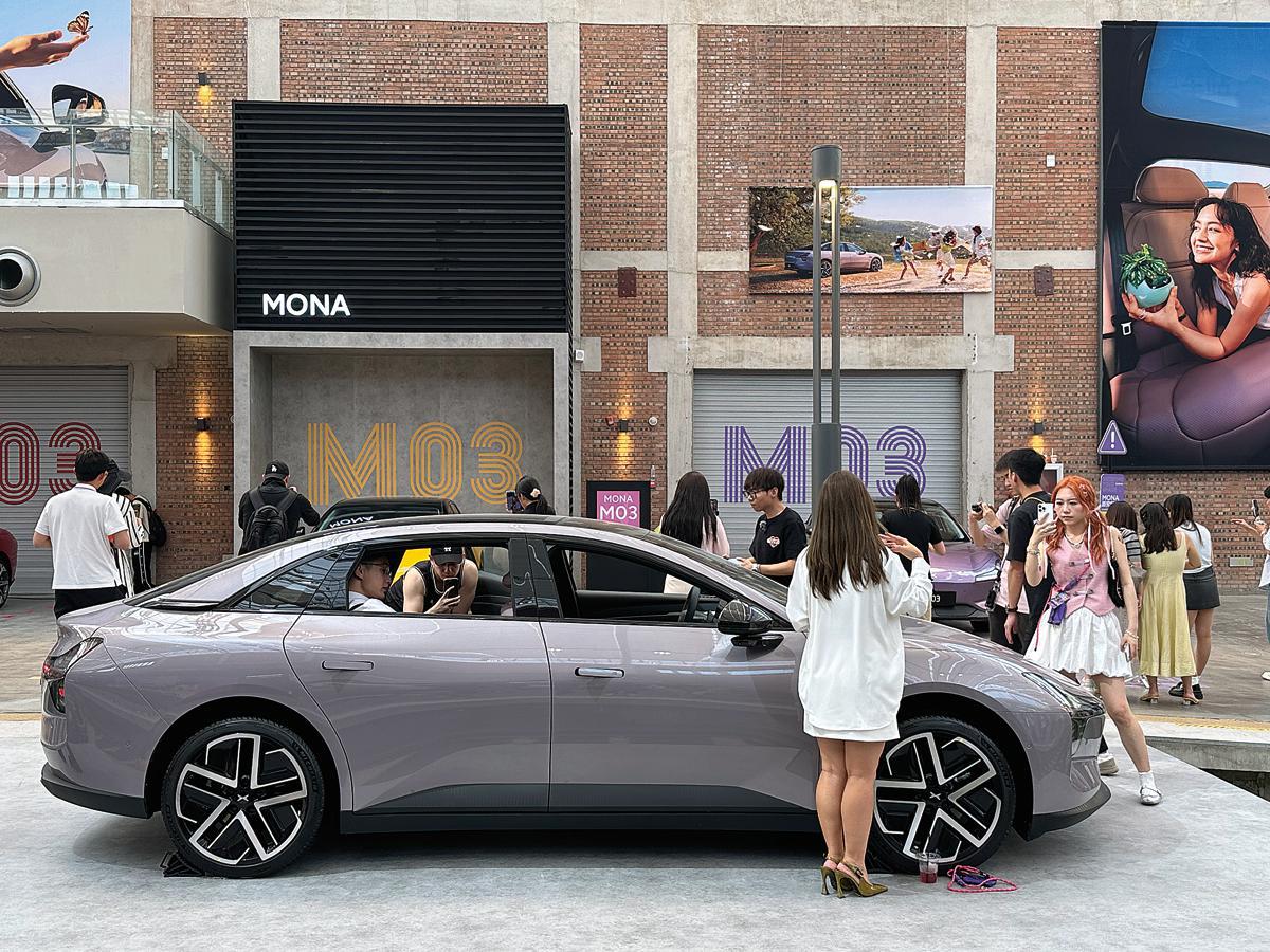 Visitors take pictures of an XPeng Mona M03 at an event on May 28 in Beijing. LI FUSHENG/CHINA DAILY