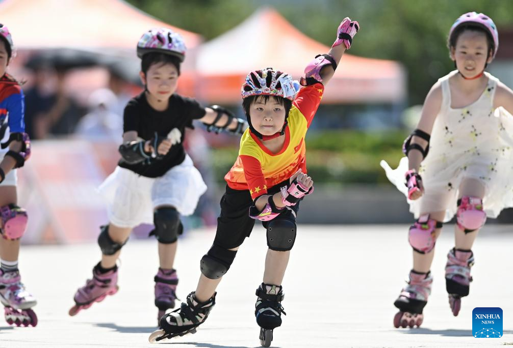 Children have a roller skating competition in Zaozhuang City, east China's Shandong Province, July 5, 2025. (Photo by Li Zhijun/Xinhua)