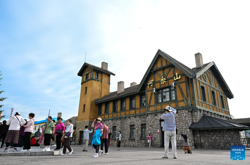 Tourists visit the railway station of Arxan in Hinggan League, north China's Inner Mongolia Autonomous Region, July 4, 2025. Arxan, located at the southwestern foot of the Dahinggan Mountains and at the intersection of four major grasslands, is an increasingly popular tourist destination. (Xinhua/Bei He)