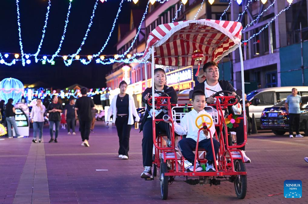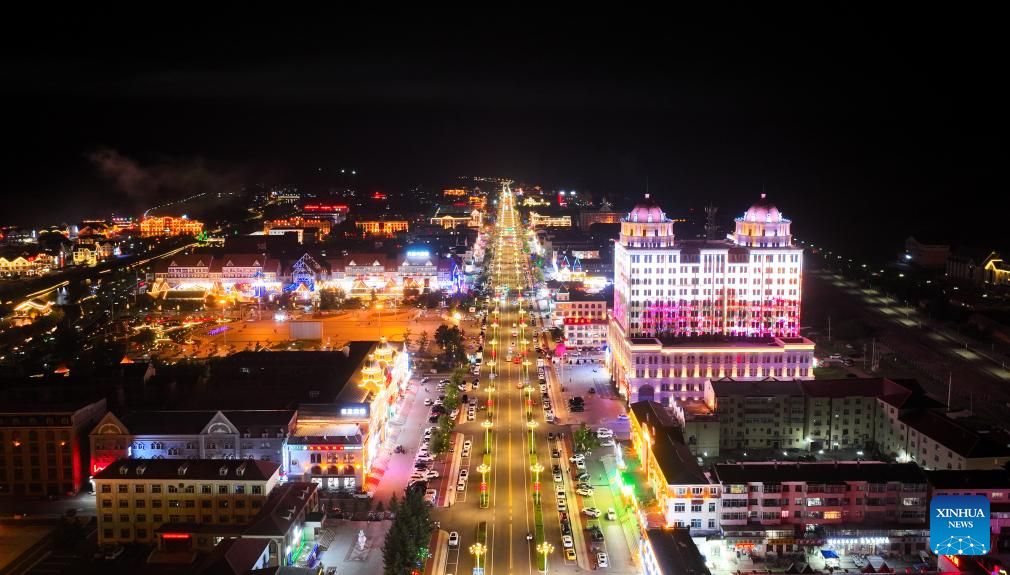 An aerial drone photo taken on July 4, 2025 shows a night view of Arxan in Hinggan League, north China's Inner Mongolia Autonomous Region. Arxan, located at the southwestern foot of the Dahinggan Mountains and at the intersection of four major grasslands, is an increasingly popular tourist destination. (Xinhua/Bei He)