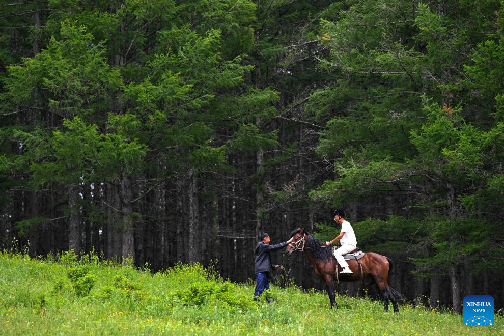 A tourist rides a horse at the national forest park in Arxan of Hinggan League, north China's Inner Mongolia Autonomous Region, July 5, 2025. Arxan, located at the southwestern foot of the Dahinggan Mountains and at the intersection of four major grasslands, is an increasingly popular tourist destination. (Xinhua/Bei He)