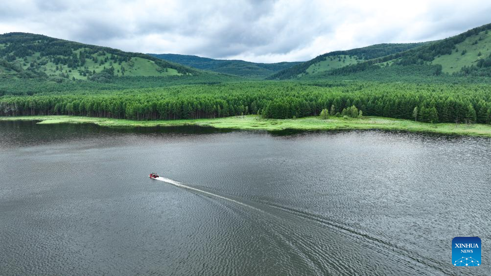 An aerial drone photo taken on July 5, 2025 shows tourists taking a boat tour at the national forest park in Arxan of Hinggan League, north China's Inner Mongolia Autonomous Region. Arxan, located at the southwestern foot of the Dahinggan Mountains and at the intersection of four major grasslands, is an increasingly popular tourist destination. (Xinhua/Bei He)