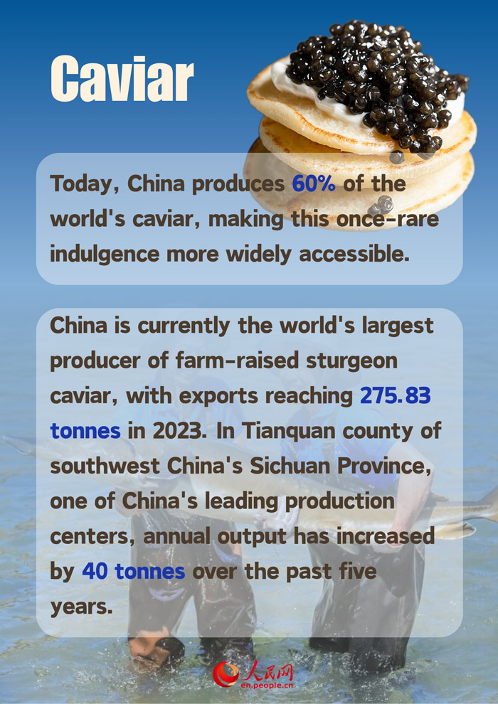 According to the Ministry of Agriculture and Rural Affairs, China is currently the world's largest producer of farm-raised sturgeon caviar, with exports reaching 275.83 tonnes in 2023. In Tianquan county of southwest China's Sichuan Province, one of China's leading production centers, annual output has increased by 40 tonnes over the past five years.
