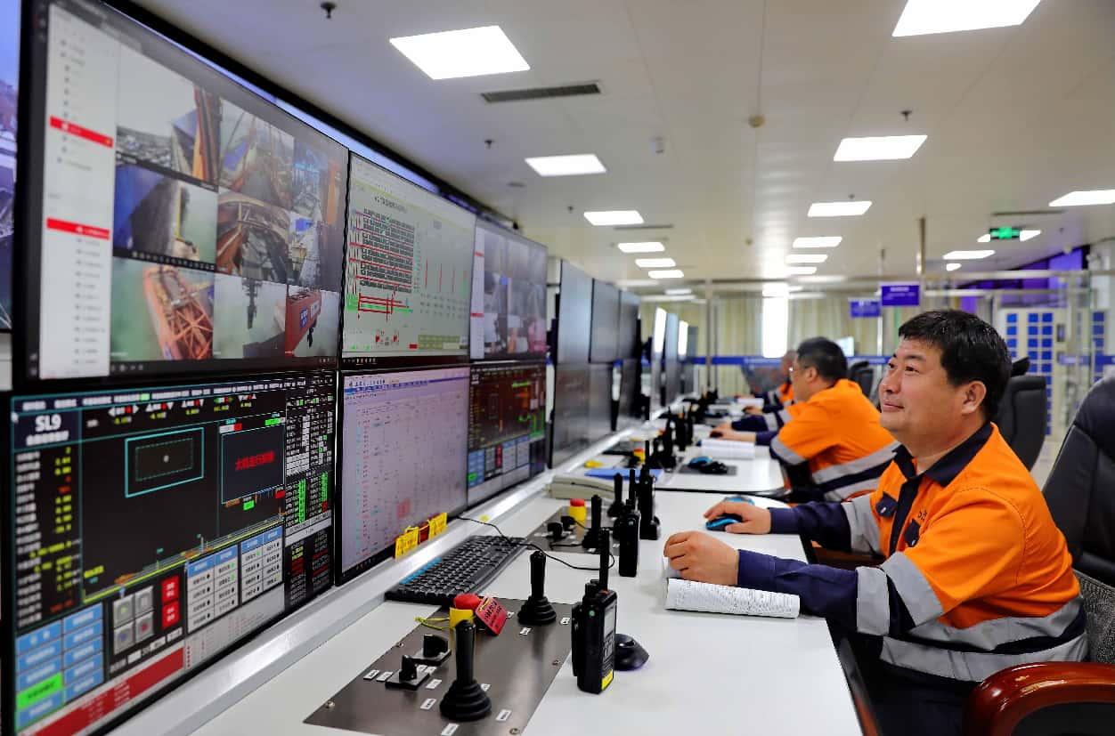 Staff members of Qinhuangdao Port Co., Ltd. under Hebei Port Group operate port machines in a control center. (Photo by Cao Jianxiong/People's Daily Online)