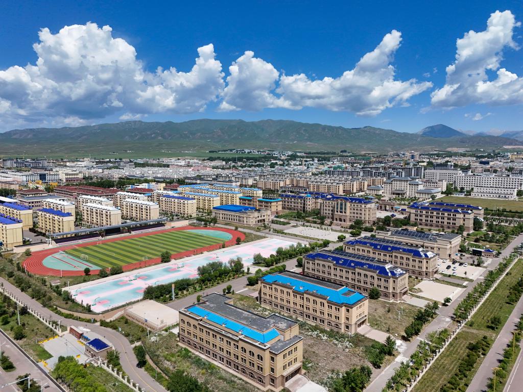 An aerial drone photo taken on July 4, 2025 shows a high school supported by Taizhou of east China's Jiangsu Province, in Zhaosu, northwest China's Xinjiang Uygur Autonomous Region. (Xinhua/Hu Huhu)