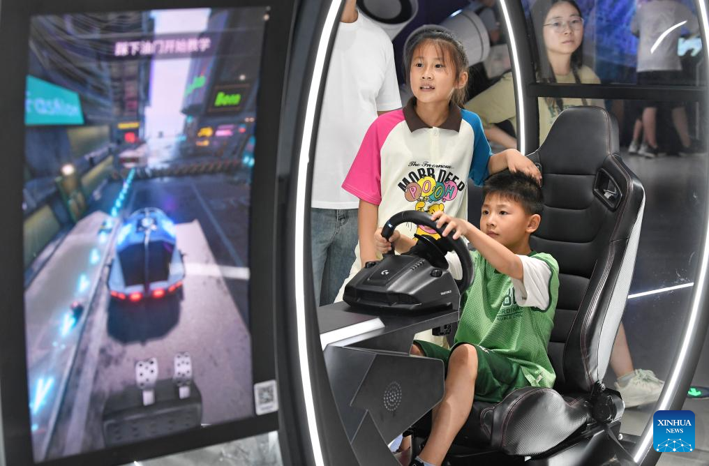 Children try a racing game at Anhui Science and Technology Museum in Hefei, east China's Anhui Province, on July 6, 2025. Students across the country are enriching their summer vacations through colorful activities. (Photo by Chen Sanhu/Xinhua)