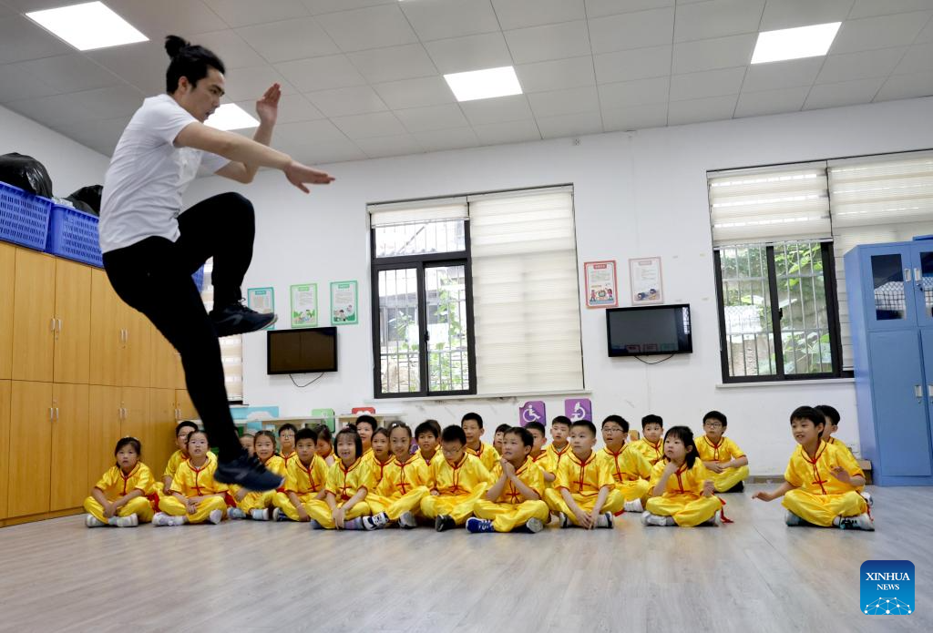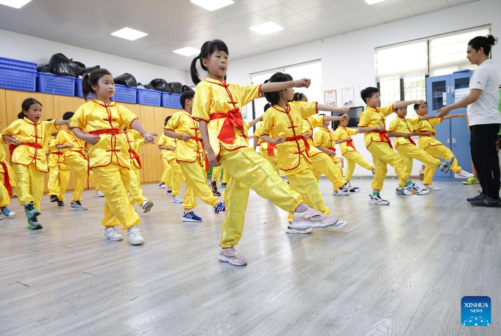 Children practice martial arts at Laoximen Street, Huangpu District of east China's Shanghai, on July 7, 2025. Students across the country are enriching their summer vacations through colorful activities. (Xinhua/Fang Zhe)